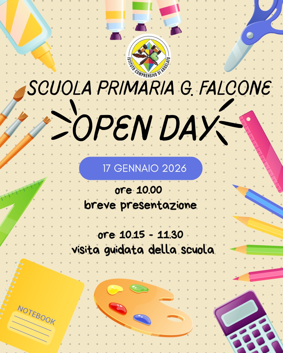 Sabato 17 gennaio 2026, dalle ore 10.00 alle ore 11.30, la scuola primaria “G. Falcone” aprirà le sue porte in occasione dell’Open Day.
